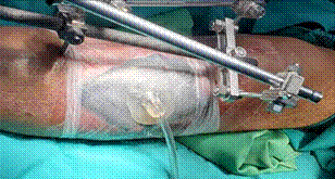 Al día 28, ingresa a quirófano bajo anestesia general, se realiza readecuación de tutores externos, limpieza quirúrgica con solución salina al 0.9%. Se realiza corticotomía de hueso expuesto y perforación cortical de tibia proximal, además de colocación de esponjas en zona cruenta y se deja con sistema de presión negativa (VAC). Se cubre con guata y venda elástica. El procedimiento duró 2 horas 45 minutos y los hallazgos fueron: zona cruenta de 11x7 cm que expone la piel, músculo y hueso (4x2 cm) y al realizar perforación ósea se tuvo como resultado una visualización de sangrado profuso.