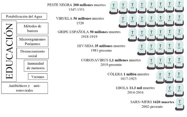 Figura 1. El conocimiento combate pandemias: En la parte izquierda de la figura se encuadran algunos de los íconos, productos de la Educación, que han permitido a la largo de la historia, combatir las grandes pandemias que ha sufrido la humanidad.