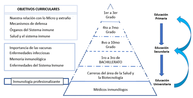 Cada proyecto diseñado por los estudiantes Universitarios, dentro de las dimensiones descritas anteriormente, puede ajustarse según avancen o cambien los objetivos de la cátedra de Inmunología, ya que, consiguiendo apoyo de sectores públicos o privados, los puntos 4 al 7 pueden variar según sea el caso, incluso, si se logra la integración curricular de los aspectos propuestos como niveles piramidales de la enseñanza del sistema inmune (Figura 2).