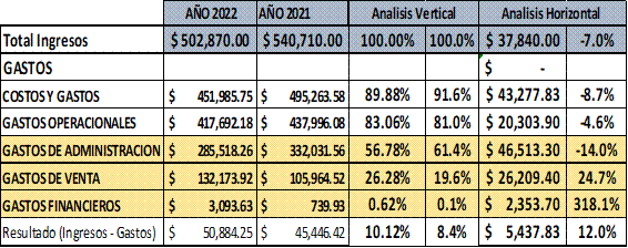 Se realizó una comparación entre el año 2021 y 2022 mediante el análisis vertical y horizontal del Estado de resultados de la empresa Transpfar S.A, para el 2021 representa un valor de $540.710,00 en comparación al 2022 se estimó a $502.870,00 dólares, diferencia que generó un decrecimiento en sus ingresos a $37.840,00. Sin embargo, en el 2021 los gastos de administración representan el 61.40% en relación con los ingresos totales, mientras que en los gastos de venta hubo una disminución de 19.6% en comparación al año 2022 con porcentaje del 26.28%. Es importante considerar que dentro de los costos de venta se detallan las subcuentas de Sueldos, beneficios sociales y demás obligaciones sociales, mientras que en los gastos de administración los valores de combustibles subieron de 6.10% a 7.11% y los gastos de mantenimiento de vehículos también aumentaron del 11.11% al 13.41%, valores muy significativos.