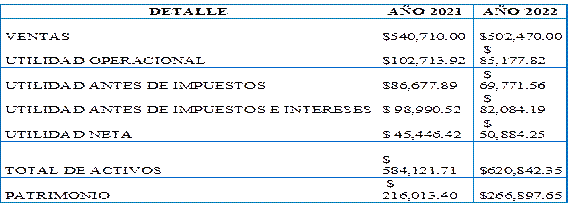 En el detalle del Estado de Resultado, se puede comparar que para el año 2022 en el periodo de estudio, los ingresos por ventas dismunuyó a un valor de $38240,00 expresado en dolares americanos, y es importante destacar que la utilidad antes de impuesto e intereses se redujo de manera significativa, y por lo tanto la utilidad en el 2022 se evidencia un crecimiento proporcional, sim embargo, es importante reducir sus costos /gastos sin dejar de brindar un servicio de calidad.
