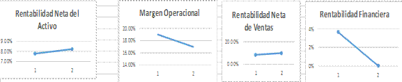 En referencia a los datos obtenidos, se realizó el cálculo de los indicadores de rentabilidad y de resultado porcentual se presenta variaciones ascendentes y descendentes partiendo desde la Rentabilidad neta del activo en el año 2021 por cada dólar de venta represento un 7,78% de margen de contribucion en la utilidad y la rotacion de activos en funcion y en el año 2022 por cada dólar de venta gano un 8,20% de utilidad. Mientras que el margen operacional indica si el negocio es o no es lucrativo, para este inidicador bajo de 19% a 16,95% pero sigue siendo positivo.