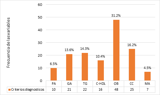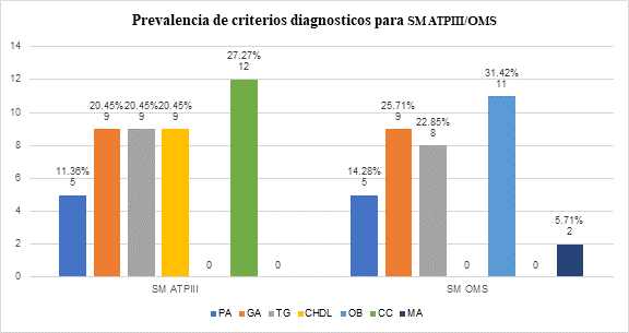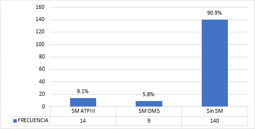 Uno de los criterios que se utilizó para el diagnóstico de SM en nuestro estudio fue la circunferencia de cintura que de acuerdo a la ATPIII debe ser mayor o igual a 88 cm. Existen polémicas acerca del punto de corte para circunferencia abdominal en Latinoamérica, debido a que algunos estudios han utilizado un punto de corte entre 84 y 92 cm (21).