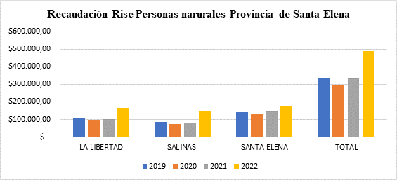 De acuerdo con la elaboración de tablas en base a las fuentes oficiales del Servicio de Rentas Internas en referencia a la Prov. De Santa Elena, el cantón Santa Elena contribuye con mayor significancia en pago de impuesto las personas naturales con el Régimen Impositivo Simplificado (RISE) con un valor de 140.668 dólares en relación con el 2019, mientras que en el 2022 el cantón Santa Elena con una contribución de $178.879,00 dólares, de esta manera se visualiza un incremento en pago de tributo y de una cultura tributaria.