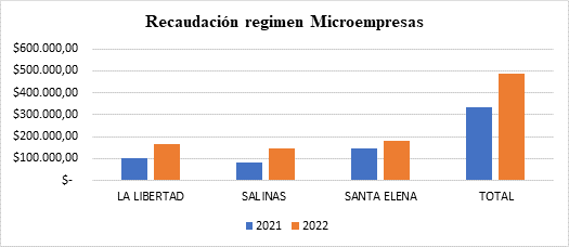Las cifras emitida por el Servicio de Rentas Internas de la Provincia de Santa Elena de Régimen Micro empresa, se puede comprar entre el año 2021 a 2022 un incremento en sus recaudaciones en el cantón de Santa Elena con un valor de $ 31.278 dólares, mientras que en el cantón La Libertad un valor de $ 62574, es decir qué; el cantón La Libertad por ser un cantón comercial y se denomina microempresas debido poseen ciertas características de un máximo de 10 empleados y su nivel jerárquico es entre jefe y trabajadores, que cubren un mercado pequeño. En conclusión, la recaudación de impuesto es significativa, valor que sirve y aporta al estado para su inversión social.