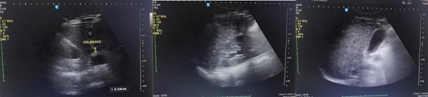 Lo valorable de las vías biliares intra y extrahepáticas de calibre normal. Signos de esplenomegalia y liquido libre en espacio peri-esplénico.