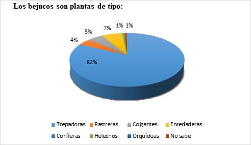 La Figura 2 da cuenta, como ejemplo consistente, que maestros y directivos no tienen un conocimiento generalizado y sólido sobre el bejuco real. Estas falencias pueden estar justificadas por el hecho de que la totalidad de los docentes y directivos no pertenecen a la cultura Mokaná, proviniendo todos del área urbana de la ciudad de Barranquilla y de municipios cercanos.