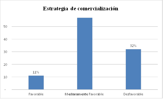 Que, los resultados muestran a las estrategias de comercialización, muestra, donde el 11 % en forma favorable, otro grupo el 57, %, medianamente favorable, asimismo se tiene una respuesta donde el 32% opina en forma desfavorable.