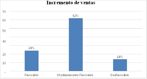 De la misma manera la variable incremento de ventas. los artesanos responden con el 24 % en forma favorable, en cuanto al indicador, medianamente favorable respondieron el 62%, asimismo obtenemos que el 14% en forma desfavorable.