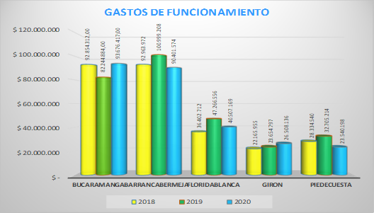 Cuando se analiza de forma general los gastos de funcionamiento de los municipios se evidencia que Bucaramanga, aunque tuvo una disminución para el año 2019, incrementó su monto para el siguiente año. Con relación a los demás municipios, están en un rango positivo debido al buen comportamiento fiscal de las administraciones y el cual se ha dado por el temor al receso por cambio de administración y cuarentena