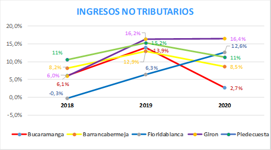 Sobre las variaciones porcentuales de los ingresos no tributarios, el municipio que tuvo mejores registros fue Piedecuesta en donde sus ingresos no tributarios demuestran superávit por lo largo del periodo en estudio, siendo positivo para su inversión en un 11% (2018), 15,2% (2019) y 11% (2020), mientras que el municipio con las menores variaciones fue Bucaramanga, que tuvo un aumento de 6,1% para el año 2018 y un aumento de 2,7% para el año 2020. De igual forma, cabe resaltar el esfuerzo realizado por el municipio de Girón, segundo municipio con mayores incrementos de los ingresos no tributarios. Teniendo en cuenta que este indicador compara lo presupuestado frente a lo recaudado, las secretarías estuvieron acordes a lo dispuesto en su planeación. Cabe resaltar la reducción de estos, que fue ocasionada por el receso producido por la cuarentena y sus derivaciones en la movilidad, ya que es la que genera más dividendos.