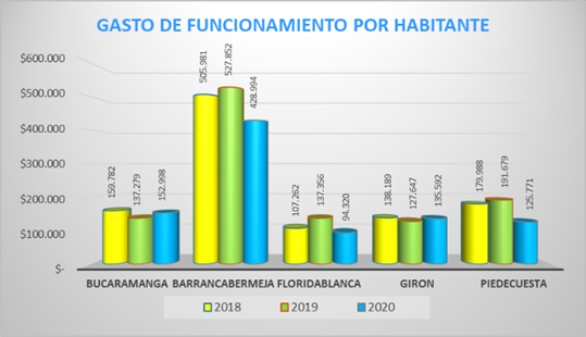 Entre los indicadores de gestión fiscal, el gasto de funcionamiento por habitante demuestra la ejecución que se realiza de ingresos para los diferentes municipios analizados presenta una tendencia general a la reducción reflejando una buena administración del gasto. Cabe advertir que también se afectan debido a los aumentos poblacionales ocasionados por la migración de venezolanos y colombianos a estos municipios, ya que en Colombia el crecimiento demográfico está en 1,9% y, para los municipios estudiados, en el periodo descrito se dio un crecimiento de 9% promedio, propiciando una desarticulación presupuestal, lo cual muestra que Barrancabermeja y Bucaramanga presentan indicadores de gasto de funcionamiento per cápita alto, igual que Girón, que es de segunda categoría.