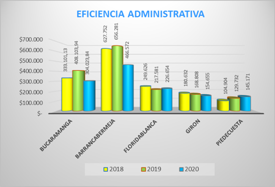 Dentro del indicador de eficiencia administrativa le sigue Bucaramanga con un monto de $304.023 pesos por habitante, el cual experimentó una caída respecto del año inmediatamente anterior, relacionado con la pandemia del Covid-19. Se resalta que Floridablanca y Piedecuesta presentaron un aumento del indicador de eficiencia administrativa para los años 2019 y 2020, a pesar de ubicarse en categorías diferentes según la ley 617 (2000). Cabe advertir que los mejores resultados fiscales también se traducen en ganancias para la ciudadanía, en mejoramiento del recaudo y en el uso eficiente de los gastos. En concordancia con lo anterior, el gasto de inversión ha crecido al tiempo que los indicadores de deuda y ahorro también han mejorado, lo que se refleja en el control de los recursos económico y el correcto uso para lograr su finalidad.