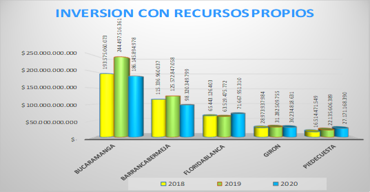 Entre las cifras se analizan las variaciones del indicador de inversión con recursos propios los cuales permiten el seguimiento y desarrollo de los planes de gobierno municipal propuestas. Se destacan los municipios de Bucaramanga y Barrancabermeja con el indicador más elevado representado en montos de $186.145 millones y $98.320 millones, respectivamente, aunque los municipios de Floridablanca y Piedecuesta tuvieron aumentos de parámetros positivos para los años 2019 y 2020, y una variación en ascenso del 12% y 22% respectivamente. Es de señalar que los municipios invirtieron por cada habitante la asignaciones reales y financieras para el desempeño de obras físicas o servicios básicos.