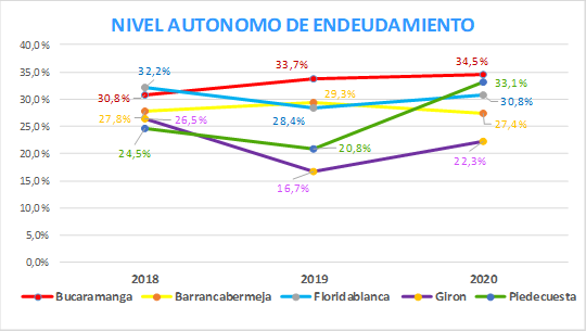 El indicador del nivel autónomo de endeudamiento de los municipios para el periodo en análisis está en un nivel máximo de 40% establecido por la ley 358 de 1997. Si supera su valor, se deberá solicitar el permiso de otras entidades señaladas en la ley mencionada. Se resalta que Bucaramanga presenta un nivel alto de autonomía para futuros endeudamientos, ya que pasó de un 30,8% en el año 2018 hasta alcanzar en el año 2020 un porcentaje de 34,5%,