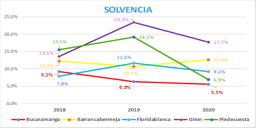 Al analizar el nivel de solvencia de los municipios se observa que Girón presentó variaciones positivas en sus niveles de solvencia frente a las demás entidades analizadas, mientras que Bucaramanga tuvo variaciones positivas mínimas en los niveles de solvencia. Por otra parte, Barrancabermeja viene mejorando sus indicadores de solvencia al pasar de un 10% en 2019 a 12,6% en 2020.