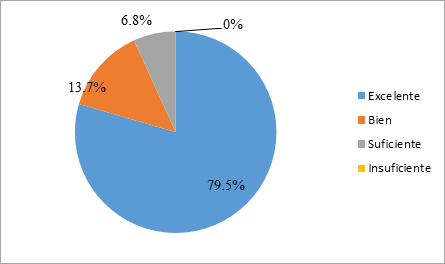 En lo referente a la pregunta sobre la Presentación de la Secuencia a desarrollar durante las Jornadas de Práctica Educativa, se puede evidenciar que el 79.5 % de los docentes titulares mencionan que los normalistas lo realizaron de manera excelente, mientras que el 13.7 % lo considera bueno, contra un 6.8% de suficiente, resaltando que nadie mencionó el indicador de insuficiente. Por lo que se considera que los normalistas previamente dedicaron el tiempo suficiente para organizar y planear las secuencias asignadas a trabajar con la finalidad de reflejar un alto compromiso al momento de su práctica, los titulares destacan que los practicantes en el primer día presentaron la modalidad y forma de trabajo a desarrollar durante su estadía, por lo que se notó un desempeño académico sistemático.