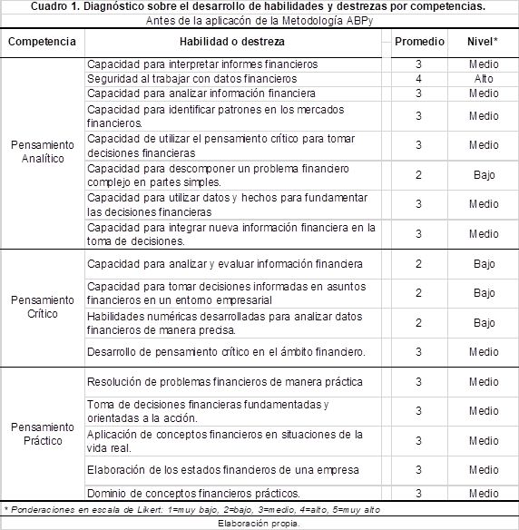 Previo al diagnóstico, todos los alumnos reportaron que no tenían experiencia laboral en el área financiera, y todos ya habían cursado una asignatura de Finanzas Básicas en la misma universidad, lo que explica que no se presentaran sesgos o datos atípicos en los datos obtenidos de las evaluaciones y que ya se contara con cierto grado de desarrollo de las destrezas y habilidades delineadas para cada competencia, como se observó en el Cuadro 1.