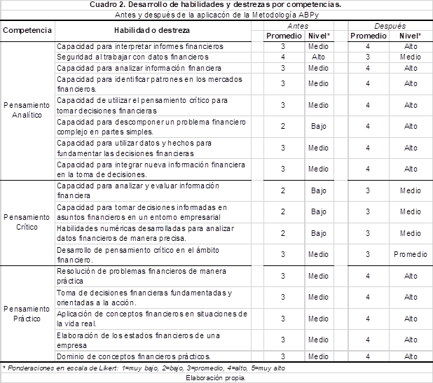Una comparación de las valores promedio alcanzados en las evaluaciones realizadas antes y después de la aplicación de la metodología ABPy permite observar que se alcanzó un mejor nivel de desarrollo en prácticamente todas las habilidades y destrezas que conforman las tres capacidades de estudio. La capacidad pensamiento analítico registró un notable incremento al pasar de nivel “medio” a nivel “alto” en 75% (seis de ocho) de las destrezas y habilidades evaluadas. La capacidad pensamiento crítico también incrementó su nivel de desarrollo al pasar de nivel “bajo” a nivel “medio” en 75%, esto es, en tres de las cuatro destrezas y habilidades evaluadas. En el caso de la capacidad pensamiento práctico, todas las habilidades y destrezas incrementaron su nivel de desarrollo al pasar de “medio” a “alto”. Solamente una habilidad correspondiente a la capacidad Pensamiento Analítico, “seguridad al trabajar con datos financieros” mostró un descenso en su desarrollo al pasar de “alto” a “medio” en este nivel de análisis. (Cuadro 2).