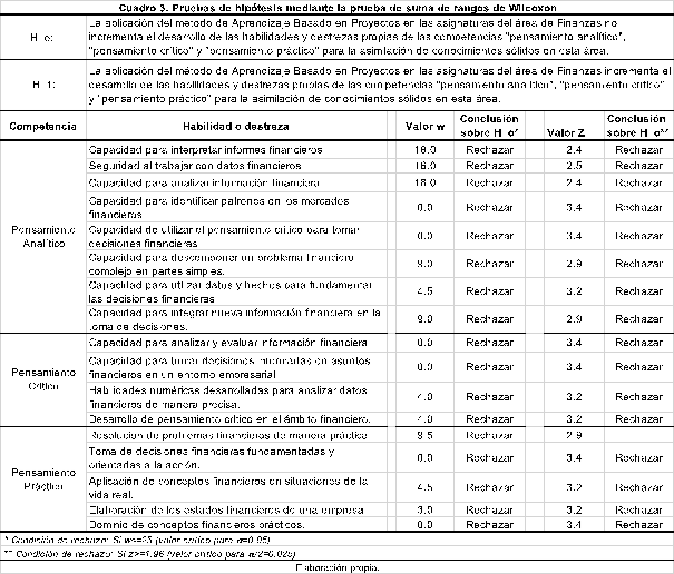 La aplicación de esta metodología para las pruebas de hipótesis en todas las habilidades y destrezas corroboró lo obtenido con la prueba anterior, esto es, se rechazó la hipótesis nula en todos los casos (Cuadro 3), corroborando la conclusión de que es falso que la aplicación del método ABPy en las asignaturas del AF no incrementa el desarrollo de las habilidades y destrezas propias de las competencias "pensamiento analítico", "pensamiento crítico" y "pensamiento práctico" para la asimilación de conocimientos sólidos en esta área; y que las diferencias encontradas en cada evaluación (antes y después de la implementación de la metodología ABPy) sí son estadísticamente significativas.