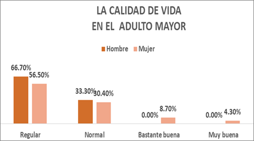 La primera pregunta que se realizó a los adultos mayores fue ¿cómo calificaría su calidad de vida?, en la cual, indudablemente se visualiza que en relación con ambos sexos responden tener una calidad de vida regular, denotando el mayor porciento en los hombres, teniendo en cuenta que los hombres tienen una percepción más favorable, sobre la calidad de vida que las mujeres. Coincidiendo con los hallazgos encontrados por Gallardo-peralta..et al (2018), al plantear que los hombres, padecen menos enfermedades crónicas (muchas de ellas invalidantes), experimentan menos sentimientos negativos o depresivos.