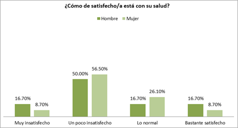 Respecto a la Salud ¿cómo de Satisfecho (a) esta con su salud?, de acuerdo con la Figura, se puede observar que el 56% de las mujeres entrevistadas se encuentran un poco insatisfechas, y en un 50% los hombres tienen el mismo sentir, esta diferencia puede estar ligada al rol social que cumple una mujer o un hombre adulto mayor, y dentro de este, el desempeño de ciertas actividades como el trabajo, la movilidad, entre otros. Los resultados del análisis entre el género y la percepción sobre satisfacción de su estado de salud no se observa diferencia significativas. Resultados similares se encontraron en el estudio de