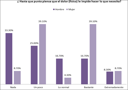 Esta figura representa paridad en dos situaciones que perciben las mujeres sobre el dolor, con un porcentaje del 39.10% en un poco y en bastante. Consideran que es una barrera para seguir realizando sus actividades de la vida diaria a diferencia de los hombres que en un 33.3 % responden que Nada, les impide hacer lo que necesitan. Quiere decir que la mujer percibe tener un desgaste físico mayor que los hombres debido a mayor responsabilidad en cuestión de las actividades en el hogar y en el trabajo. Este dato es concordante con los obtenidos en el estudio efectuado por Castillo, et al. (2012) quienes observan que los hombres informan de una buena salud (auto reporte que califica la salud como buena, muy buena y excelente).