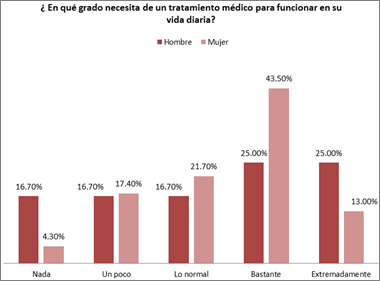 Con base en la Figura 4, se observa que el 43.50% las mujeres contestaron que Bastante, al contestar la pregunta ¿En qué grado necesitas de un tratamiento médico para funcionar en su vida diaria? en relación con el género la mujer necesita de un tratamiento para cumplir con sus tareas o actividades sin problema a diferencia que el hombre, el porcentaje en relación con los hombres sobre el 25%. En esta gráfica podemos describir que solo el 4.30% de las mujeres dicen no necesitar de un tratamiento médico para realizar sus funciones diarias.