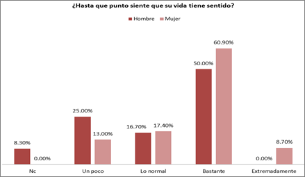 De acuerdo con la siguiente Figura, se puede observar que el 60.9% de las mujeres y el 50% de los hombres, adultos mayores encuestados, encuentran un significado en su vida ya sea familiar, religioso, espiritual o personal, la mayoría de los adultos mayores encuentran el sentido de la vida cuando experimentan la necesidad de sentirse útil que, por el contrario, en esta etapa de su vida pueden experimentar aislamiento, abandono, soledad, e indiferencia por parte de sus familiares o amigos.