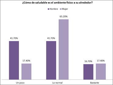 De acuerdo con la siguiente Figura, el 65.20% de las mujeres consideran lo normal, saludable el ambiente físico que los rodea, por su parte los hombres con un 41.7% responden que un poco y lo normal es saludable el ambiente que los rodea, dado que un buen entorno es esencial para cada individuo, encontrándose una serie de factores que son clave para la igualdad y la integración a la hora de envejecer. Los entornos deben evolucionar al mismo ritmo que lo hace la población ya que, de no ser así, dejaremos desatendidas muchas necesidades básicas de los adultos mayores convivan armónicamente con sus familiares.