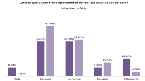 En la Figura se observa que las personas adultas mayores, en especial las mujeres en un 47.8 % y 33.3 % tienen un poco de oportunidad de realizar actividades de ocio, en su mayoría los adultos mayores desarrollan actividad física, realizan juegos de mesa, las mujeres dedican tiempo a los tejidos, tiempo para ir a caminar o realizar algún deporte de acuerdo con sus condiciones físicas.