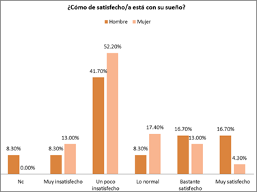 La Figura 8 muestra que en la mayoría de los adultos mayores predomina la insatisfacción con su sueño, ya que el 52.2 % de mujeres y el 41.7% de hombres respondieron estar un poco insatisfechos, en esta etapa aun consideran tener la capacidad para realizar otras actividades y conciliar el sueño y así poder descansar.