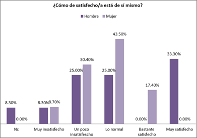 La Figura 9 ilustra que la mayoría de los adultos mayores mujeres en un 43.5 % encuentran sentirse satisfechos normal tanto en salud, físico y mental, ya que en esta etapa se sienten satisfechos de sí mismo lo cual es un factor que influye en el desempeño de ciertas actividades de la vida diaria y describiendo que las mujeres están más satisfechas de sí mismas en relación con los hombres, esto indica que hay varios factores que determinan la felicidad y en este caso su ambiente familiar.