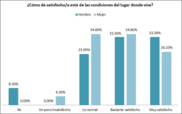 La Figura presente que un 33.3 % de hombres y un 34.8% de mujeres de la población de adultos mayores encuestados se encuentran bastante satisfechos con las condiciones en las que vive, a pesar de algunas carencias, demuestran que tienen lo suficiente para poder vivir, uno de los dominios que nos marca el instrumento de la percepción de la calidad dice que el lugar donde habita el adulto mayor es determinante, tanto este como su entorno familiar para sentirse satisfecho de sí mismo.