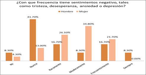 Al preguntarle ¿con que frecuencia tiene sentimientos negativos, tales como tristeza, desesperanza, ansiedad o depresión?, encontramos que los hombres respondieron con un porcentaje del 41.7% nunca se han sentido así, y que las mujeres con un 34.8 % lo han sentido moderadamente sentimientos negativos.