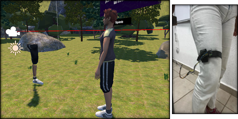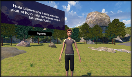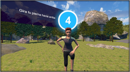 La Ilustración 1 constituye una captura de pantalla de como se ve el entorno dentro de la simulación, en ella podemos observar como el ambiente esta modelado y texturizado para asemejar un campo relajante, sobre el se encuentra el paciente observando al entrenador, el entrenador funge la misión de ser el guía, por medio de diversas animaciones este puede indicarle al jugador como es que deberá mover la pierna, la flexión esta limitada a 3 movimientos en los cuales se pone a prueba la capacidad del paciente de realizarlos. Por medio del sensor giroscópico es que se puede saber si está realizando correctamente el ejercicio como podemos ver en la ilustración 2.