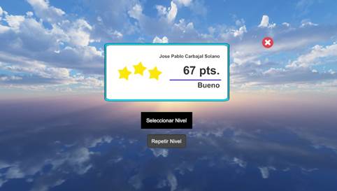 Como se puede observar en la ilustración 3 nos arroja un resultado de la partida con un 67%, el cual se clasifica como bueno, demostrando una mejora notable en su movilidad y una reducción significativa en el dolor muscular, respaldando así la efectividad y aceptación de la herramienta en el contexto clínico.