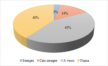 La gráfica revela que un 43% de los encuestados juzgan que a veces están de acuerdo con las actividades y recursos que el docente emplea en las clases de álgebra; y un 34% de los involucrados manifiestan nunca estar de acuerdo con la metodología empleada; un 17% está casi siempre de acuerdo y finalmente un 6% muestra estar siempre conforme con las actividades y recursos. Por lo tanto, la mayoría de estudiantes no se sienten cómodos o no están de acuerdo con las actividades y los recursos que emplea el docente en el aula de clases con respecto al álgebra, por lo cual es necesario desarrollar actividades que fomente la participación y motivación del alumnado.