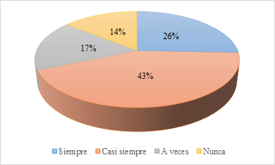 De acuerdo a los datos obtenidos de los estudiantes, refleja en mayor cantidad, con un 43% que casi siempre se les dificulta las clases que emplea su docente según el proceso de aprendizaje que utiliza. Del mismo modo, un 26% indica que siempre ocurre aquello; finalmente, una representación baja con el 17% muestra que ello ocurre a veces. Por esta razón, se considera que el proceso de aprendizaje que emplea actualmente el docente no es el adecuado, ya que los estudiantes no se sienten conformes con la utilización de los recursos, estrategias y actividades.