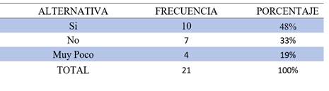 Mediante la encuesta realizada en la primera pregunta el 48% respondieron que, si tienen conocimiento sobre el proceso de cambio de la matriz productiva, el 33% que no y el 19% que muy poco. Dando el resultado del 100%.