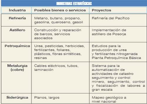 El rol de los sectores estratégicos enfocados en la inversión, el talento humano y la innovación tecnológica pretenden desarrollar infraestructuras, generar empleo, transferir tecnología, consolidar inversiones de sectores estratégicos, mejorar la competitividad sistémica y atraer la inversión nacional e internacional.