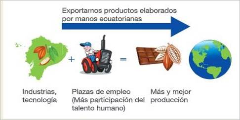 Cabe indicar que las exportaciones de productos nuevos, provenientes de actores nuevos; particularmente de la economía popular y solidaria, o que incluyan mayor valor agregado en los sectores de alimentos frescos y procesados, turismo, confecciones y calzado. Con el fomento a las exportaciones buscamos también diversificar y ampliar los destinos internacionales de nuestros productos. Secretaría Nacional de Planificación y Desarrollo. (2012). Lo que se busca es organizar la producción partiendo del cono-cimiento y las relaciones sociales generando sostenibilidad en el mundo. Razón por la cual la Secretaría Nacional de Planificación y Desarrollo (SENPLADES) y todos sus stakeholders, han identificado 14 sectores productivos y 5 industrias estratégicas para el proceso de cambio de la matriz productiva del Ecuador, facilitando la efectiva interrelación entre las políticas públicas y sus áreas de intervención con las industrias.