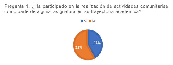 En la figura 1 donde se cuestiona sobre si ¿Ha participado en la realización de actividades comunitarias como parte de alguna asignatura en su trayectoria académica? El 58% de los estudiantes manifestó no haber participado ni realizado actividades comunitarias, mientras que el 42% manifestó que sí ha participado y realizado actividades comunitarias.
