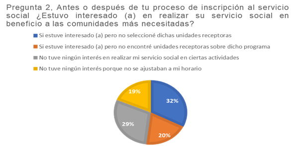 En la figura 2, antes o después de tu proceso de inscripción al SS ¿estuvo interesado (a) en realizar su servicio social en beneficio a las comunidades más necesitadas? El 32% manifestó haber estado interesado en realizar su servicio social en beneficio a las comunidades más necesitadas, pero no seleccioné dichas unidades receptoras, el 29% no tuvo ningún interés en realizar su servicio social en ciertas actividades, el 20% si estuvo interesado, pero no encontró unidades receptoras de dichos programas y el 19% no tuvo ningún interés porque no se ajustaban a su horario.