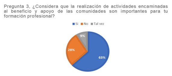 En la figura 3, ¿Considera que la realización de actividades encaminadas al beneficio y apoyo de las comunidades son importantes para tu formación profesional? El 63% de los encuestados manifestó que la realización de dichas actividades si son importantes, mientras que el otro 28% de los encuestados manifestó que no son importantes y el 9% consideró que tal vez si son importantes para su formación profesional.