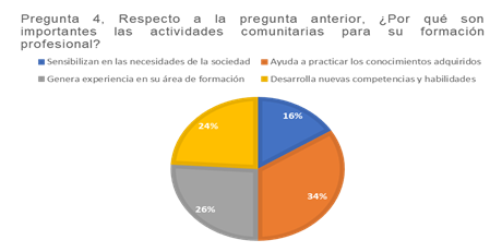 Sin embargo, en la Figura 4 se les preguntó por qué es importante para su formación. El 34% de los encuestados manifestó que la realización de actividades que beneficien y apoyen a las comunidades son importantes para su formación profesional porque los ayuda a practicar sus conocimientos adquiridos, el 26% manifestó que le genera experiencia en su área de formación, el 24% manifestó que los ayuda a desarrollar nuevas competencias y habilidades, mientras que el 16% manifestó que son importantes porque los sensibilizan en las necesidades de la sociedad.