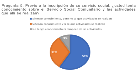 De acuerdo a la figura 5, previo a la inscripción de su servicio social, ¿usted tenía conocimiento sobre el Servicio Social Comunitario y las actividades que allí se realizan? A lo que el 59% manifestó tener conocimiento el programa de Servicio Social Comunitario, pero desconoce las actividades que allí se realizan, el 32% manifestó conocer sobre el Servicio Social Comunitario y las actividades que allí se realizan, mientras que el 9% manifestó no tener conocimiento tanto del programa como de las actividades que allí se realizan.