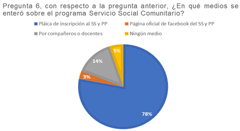 En la figura 6, con respecto a la pregunta anterior, ¿En qué medios se enteró sobre el programa Servicio Social Comunitario? El 78% manifestó haberse enterado del programa del servicio social comunitario en las pláticas que se realiza previa a la inscripción del SS y PP, el 14% por compañeros y docentes que han participado, el 5% en ningún medio y el 3% por la página oficial de Facebook del Servicio Social y Practica Profesional.