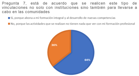 La figura 7, ¿está de acuerdo que se realicen este tipo de vinculaciones no solo con instituciones sino también para llevarse a cabo en las comunidades? El 64% manifestó estar de acuerdo que se realicen este tipo de vinculaciones no solo con instituciones sino también para llevarse a cabo en las comunidades porque abona a su formación integral y al desarrollo de nuevas competencias, mientras que el 36% manifestó estar en desacuerdo porque las actividades que se realizan no tienen nada que ver con su formación profesional.
