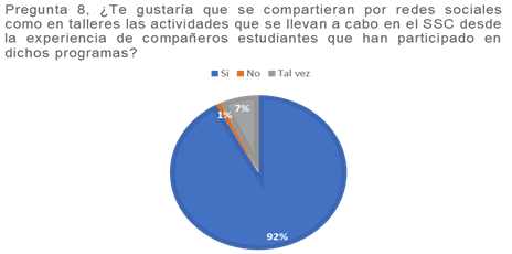 La pregunta 8, Al 92% de los encuestados le gustaría que se compartieran por redes sociales como en talleres las actividades que se llevan a cabo en el SSC desde la experiencia de compañeros estudiantes que han participado en dichos programas, mientras que el 7% manifestó que tal vez le gustaría y el 1% que no le gustaría.